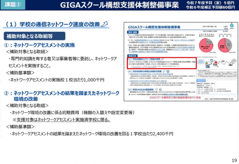 これについては、予算でサポートする。アセスメント実施について最大1校100万円、さらにその結果をふまえたネットワーク環境の改善について最大1校240万円を上限として、計340万円まで補助(補助率1/3)するという。補助対象は、配線の再敷設や、無線アクセスポイントの変更や増設、より高性能なルーターやスイッチへの変更など、アセスメントの結果を踏まえたネットワーク改善に関することが対象になる。