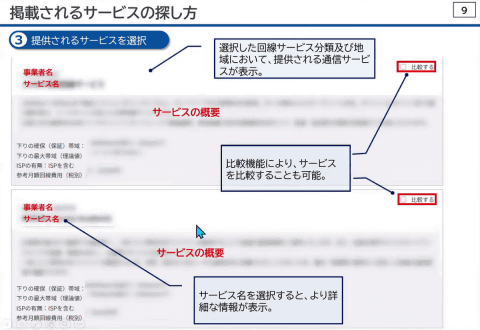 「教育DXサービスマップ」については、通信サービスを検索する方法をステップごとに説明。まず回線の種類を、「光回線サービス(1Gbps以下のギャランティ型)」「光回線サービス(1Gbpsを超えるギャランティ型)」「光回線サービス(1Gbps以下のベストエフォート型)」「光回線サービス(1Gbpsを超えるベストエフォート型)」「分離型ISP」「移動体通信」「その他」の7種類から選ぶ。そのうえで地域を選択することで、該当する通信サービスの概要が表示される。