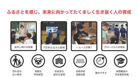 「子供たちには、 学んだことを社会や人生に生かそうとする『学びに向かう力』 を育み、 生きて働く『知識・技能』 を身に付け、 未知の状況にも対応できる『思考力・判断力・表現力』 を伸ばしてほしいと考えています。そのためには教員も答えのない課題に向き合い最善策を考えるとともに、教科横断的な幅広い知識と俯瞰力を養いながら子供たちと共に学ぶ、そんな意識で日々の教育活動に取り組んでいます」と述べている。