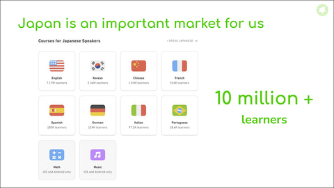 日本国内では、英語・中国語・韓国語・フランス語など複数の言語コースを提供。「スキマ時間で学べる」「ゲーム感覚で楽しい」として、学生層を中心に浸透。学習塾や大学との連携も進んでいる。