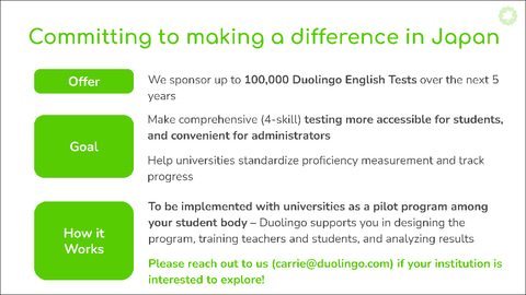 さらに、今後5年間で最大10万回分(総額700万米ドル相当)のDETを、日本の大学に無償提供する大規模な先行導入プログラムも始動。これは、大学における英語教育を学習と評価の両面で支援する取り組みで、教員や学生に無料の学習ツール「Duolingo for Schools」も提供する。