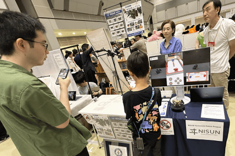 コドモ記者が足を止めたのは、「NPO日本水中ロボネット」のブース。水を張ったプールの中に、水中ロボットが展示されていた。ロボコンの実行委員や実際にロボット制作に携わった技術者を相手に、取材がスタート!ロボットがLANケーブルとタミヤのキットを使って作られていることや、水中で問題なく動作できるように防水を施すテクニックの難しさについて教わった。