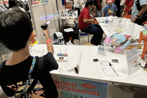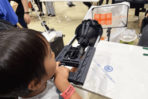 micro:bit champions & friendsのブースでは、推し活ライトや射的ゲームなど、多彩な展示が並び、兄弟は射的に夢中。micro:bitがウチにもあることを伝えると、「えっ、自分でも作れるの!?」と驚いた様子を見せていた。
