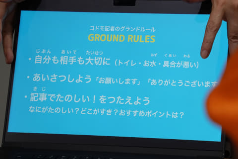 そうこうしていると、コドモ記者の集合時間に。ここからが本番だ。所要時間はおよそ1時間30分。最初に、取材のマナーを教わる。「こんにちは、質問してもいいですか?」「ありがとうございました」といった声かけの基本、そして取材中はしっかりメモを取ることも学ぶ。