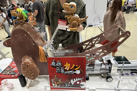 次に訪れたのは、兄が「いちばん心に残った」という、モノづくりサークル「モノトコ」のブースだ。展示されていたのは、NHKの番組『魔改造の夜』に出場した島津製作所のモンスター「魔砲恐竜カノンちゃん」。この「魔砲恐竜カノンちゃん」こと”恐竜ちゃん”は、第1回目の放送で登場したもので、「本物だ!」と興奮していた。