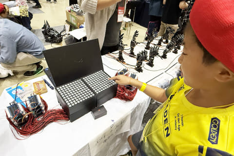 わさっと配線が生い茂るように広がった装置を前に、製作者は「中の配線がすごいことになったけど、いっぱい繋げたら僕のテンションが上がった」と笑った。後で調べてみると、ソレノイドは電気エネルギーを直線運動に変える電磁部品らしい。難しいしくみの背景にある「面白いから作った」「自分が見たかったから作った」という純粋な動機に、ものづくりの本質を見た気がした。