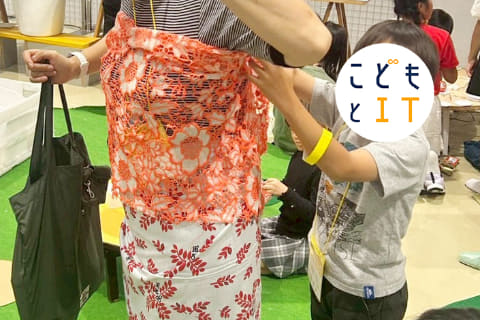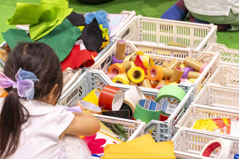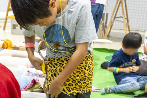 家ではいつもお菓子の箱や空き容器をかき集めては、何かを作ろうとしている兄にとって、まさに宝の山。見た瞬間から創作モードに突入し、あれこれ素材を手に取り始めた。すると、その隣で、弟が大きな布を手に、黙々とハサミを動かしはじめる。