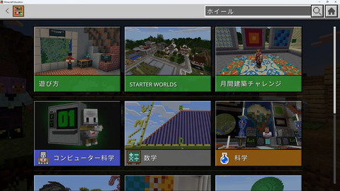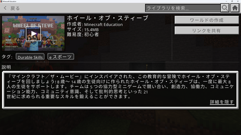 「ホイール・オブ・スティーブ」のワールドは、図書館(ライブラリ)から検索するのが手っ取り早いだろう。画面右上の検索ボックスから「ホイール」など、ワールド名の一部を入力すれば検索できる。ワールド内のコンテンツはすでに日本語化されており、児童生徒だけで遊びはじめることも可能だろう。