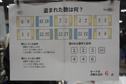 ゲームマーケットは、1日目と2日目で会場レイアウトが異なるのも特徴だ。2日目は、伝統ゲームコーナーや謎解きフェスタなど、特別企画のスペースが用意された。また、近年ブームなっているリアル謎解きゲームに関連して、「謎祭り」と題した企画も行われていた。