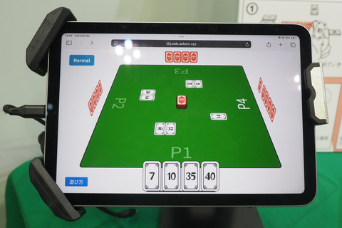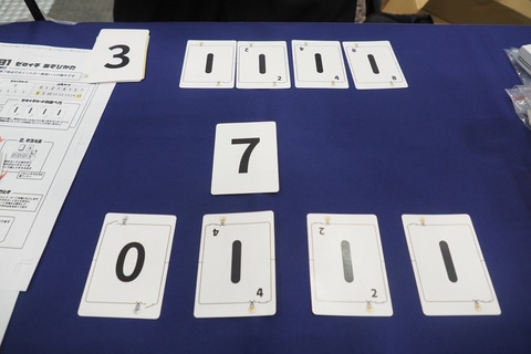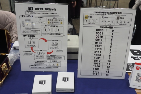 また、ゼロイチのブースでは、2進法を覚えられるカードゲーム「ゼロイチ」の試遊やスタッフとのバトル、販売が行われていた。「ゼロイチ」は、山札をめくって出た数字を、プレイヤーの手元にある4枚の「0」と「1」のカードを使って素早く作った人が勝ちというゲームだ。