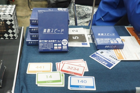 今回のブースでは、素因数分解を題材とした「素数スピード」をはじめ、高校物理の熱力学で出てくるPVグラフを題材とした「熱力学ワーカーズ」、高校化学の有機反応を題材とした「有機大富豪」が出展・販売されていた。「熱力学ワーカーズ」と「有機大富豪」は、主に高校生以上がターゲットとなるが、「素数スピード」は、小学生でも理解できる素因数分解とトランプのスピードを合わせたようなゲームであり、レベルも4段階に分かれている。小学生から大人まで楽しく遊びながら、素因数分解に親しむことができる。