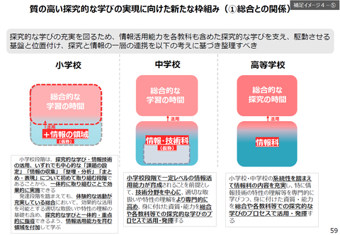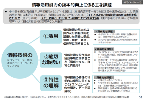 寺島: 現在、まさに議論の途中段階ではありますが、生成AI単体をどう位置付けるかというよりも、今回の 学習指導要領改訂の大きなテーマのひとつは、情報活用能力を抜本的に高めること にあります。