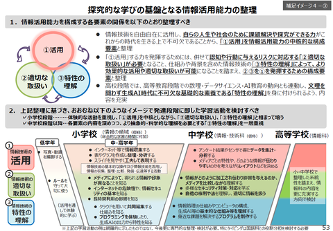 議論で重視しているのは、情報活用能力を、 情報技術の「①活用」「②適切な取扱い」「③特性の理解」 という3つの側面から、バランスよく育てることです。その中で、生成AIは情報技術のひとつとして扱われていくことになります。