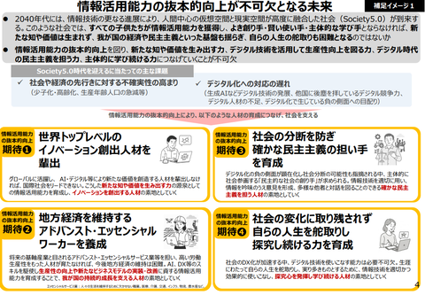 技術を使いこなせるかどうかではなく、情報社会の形成者として、主体的に判断し、他者と対話しながら社会をつくっていく。そのための基礎となる力として、情報活用能力を位置づけていきたい、というのが今回の改革の背景にあります。