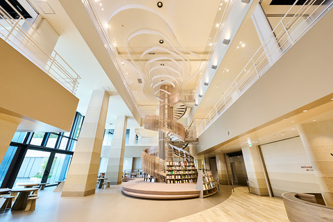ライブラリーの中央には、「感性の樹」と呼ばれるJUNOPARKのシンボルツリーが立つ。ここでは、感性を育む11のテーマに沿った約1,000冊の絵本や書籍が並ぶ。子供だけでなく、大人が思わず手に取ってしまうような絵本や書籍が並び、自然と知的好奇心が刺激される空間だ。