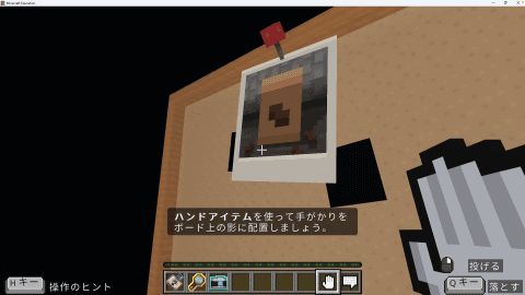 調べ終わると、近くのボードに行くように促される。ここで「手」のアイコンのハンドツールを選択し、ボードの下に貼られた写真を、黒い影に合わせて移動してピン留めしていく。