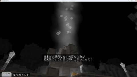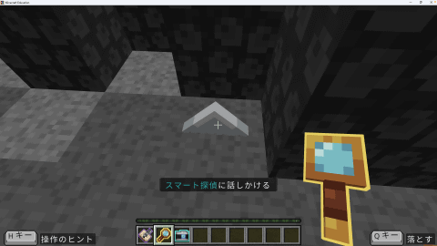 画面のスマート探偵についていこう。「パーティクル(※マイクラ内に出るキラキラした演出用のエフェクトのこと)」が見えるので、それに沿って進んでいく。画面には簡単な基本操作の説明が表示されている。