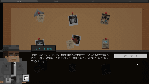 ある人物から重要な証拠を手に入れた。ピザ屋のチラシの裏には、日時とこの場所を示すメモが残されていた。さらに、手がかりを探すため、虫眼鏡とカメラを使って周囲を調べていこう。証拠が揃ったら事務所へ戻り、ボードに並べて整理する。これでブレイク氏の無実を証明できるのだろうか。