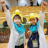 小学生編成の最優秀賞に選ばれたのは、小学2年生コンビ「イカバルーン」だ。服部はるさんの祖母お手製という、おそろいのカメ帽子で登壇した2人が発表したのは、被災した人たちを元気にする カメの島「まもりガメ」 。