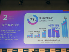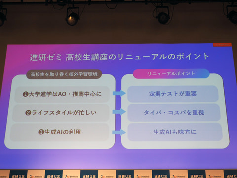高校生については、大学入試が変化し、総合型選抜や学校推薦が増えたため、内申点が大学合否に大きく影響するようになったほか、アルバイトやボランティア、趣味などで高校生の毎日がより多忙になっている。さらに、すでに高校生の半数が生成AIを利用しているという環境の変化もある。以上を踏まえた、高校講座のリニューアルのポイントは 「定期テストが重要」「タイパ・コスパを重視」「生成AIも味方に」 の3点である。