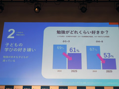 小学生へのアンケート結果では、10年前に比べて じっくり考える力や論理的に考える力を得意とする子供や、「勉強が好き」と答えた子供の割合が減っている 現状を説明。さらに、ゲームやスマートフォンの利用時間が増え、共働きが増えたこともあり、保護者の「子供の勉強」に対する悩みも増えているという。