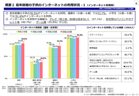 0〜9歳の子供がインターネットを利用する機器としては、「自宅用のパソコンやタブレット」(40.7%)が最も多く、「ゲーム機」(35.8%)、「スマートフォン」(25.6%)、「契約していないスマートフォン」(20.5%)などが続いた。なお、小学生に限ると「学校から配布・指定されたパソコンやタブレット(GIGA端末)」は59.8%に上る。