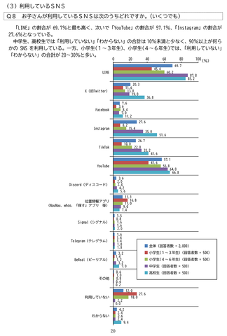 東京都生活文化スポーツ局が2025年2月に公表した「家庭における青少年のスマートフォン等の利用等に関する調査」によると、スマホを持つ小学1〜3年生と4〜6年生のSNS利用率は次の通りである。