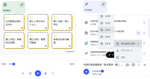 NotebookLMは、読み込んだ資料から以下のような多様なコンテンツを自動で生成し、先生方の様々なニーズに応えてくれます。