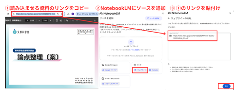 ①リンクをコピー: 読み込ませたい資料(今回は「論点整理」のPDF)が公開されているウェブページのリンクをコピーします。