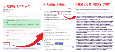 各選択肢の横にある「説明」をクリックすると、チャット欄に解説が表示されます。その横の数字をクリックすると、その根拠となる原文の箇所がハイライト表示されます。この「即時フィードバック」と「原文確認」のサイクルが、正確な知識の定着に繋がります。 AIの解釈と原文を比較検討することが重要です。