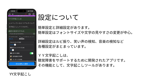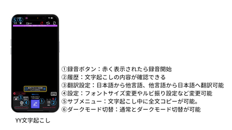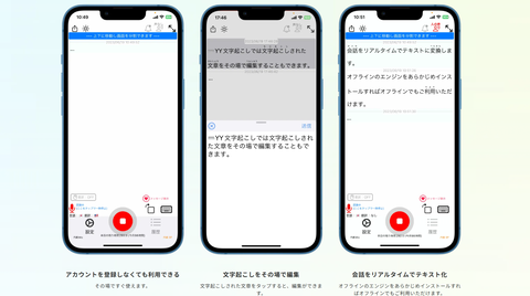 「YY文字起こし」は、音声をリアルタイムまたは録音からテキスト化できるアプリケーションです。もともと聴覚障害のある方をサポートするために開発されたもので、 オフラインでも利用でき、子供も操作しやすい 設計になっているのが特徴です。