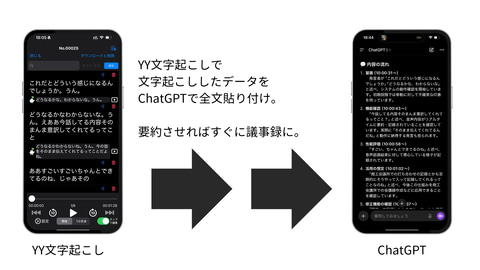 使い方としては、音声をテキスト化するのはもちろん、生成AIと組み合わせて活用するのがおすすめです。例えば、YY文字起こしで作成したテキストデータをChatGPTに貼り付けて、議事録をつくるなど業務効率化に役立ちます。