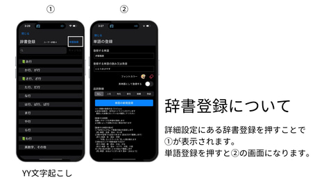 歯車のマークの「設定画面」では、 フォントサイズの変更やルビ振りが可能 です。また、「さらに詳しく設定」のボタンをタップすると、辞書登録で単語を登録することができます。固有名詞、地名、物の名前、熟語など様々な言葉を単語登録しておくと、高い精度の文字起こしが可能になります。