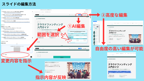 作成済みのスライドのレイアウトを変更したい場合は、編集を行うことができます。編集方法には、 Genspark内で編集する方法 と、 スライドをダウンロードして他ツールで編集する方法 の2種類があります。