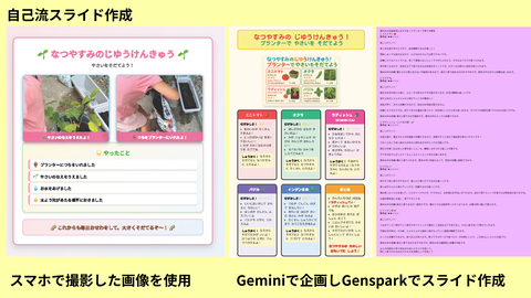 今年の夏に公開された『親子で実践!Geminiを活用した夏休み自由研究の体験記』で使用されているスライドの多くは、 Genspark で作成されています。