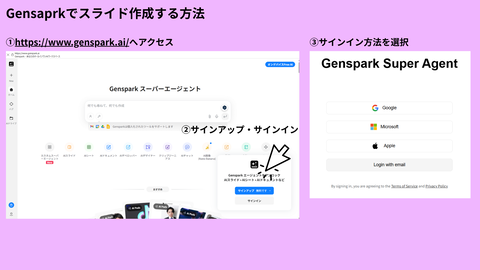 ①公式サイト「Genspark(https://www.genspark.ai/)」へアクセス