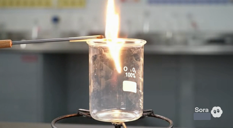 理科室で、酸素を100%充満させた大きなビーカーを用意します。そこに、長い柄の先に火をつけたマッチをゆっくりと近づけるとどうなるか、シミュレーション動画で見せてください。