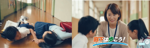 主人公の小学生が学校の廊下を走っていて、廊下の曲がり角でお互いに走ってきた児童同士がぶつかって転倒する場面「廊下を走らずに歩こう」というメッセージを伝える動画