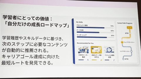 教育データ利活用について生田氏は、学習者が生涯にわたって学び続けられる「 学習エコシステム 」の構築を重視していると述べた。産官学が連携して環境を整えることで、個別最適化された学習や、データに基づく意思決定、組織としての知の蓄積につながると説明。将来的には、生徒自身が成長データをもとに、「成長のロードマップ」を描ける姿も理想として示した。