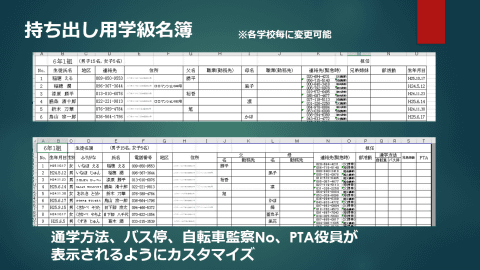 また鴨川市では、標準の名簿様式に通学方法やPTA役員、端末IDといった独自の項目を追加するなど、 学校現場のニーズに応じたカスタマイズ も進めてきた。校務支援システムを「データベース」と捉え、必要な情報を必要な形で取り出せるようにすることで、帳票作成にかかる手間の削減につなげている。