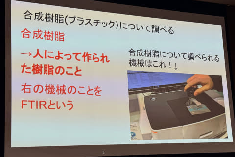 島津製作所を訪問した三島惟愛さん(中2)は、交通系ICカード「PiTaPa」の仕組みに着目。「 分析計測機器(PCEDX) 」や「 フーリエ変換赤外分光光度計(FTIR) 」を用いてカードに使われる素材を分析し、「なぜその素材が選ばれているか」を探った。
