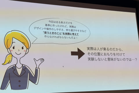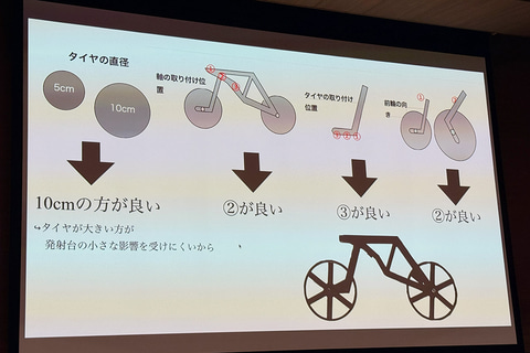 その結果、タイヤは大きい方がよく走り、取り付け位置や向きによっても走行距離に差が出ることがわかった。しかし、実験後に「ものを作るときは、実際に使うときのことを考えることが大切」というアドバイスを受けて、「人が乗る位置に重りをつけて実験をする方が良いのではないか」と新たな気づきを持った。