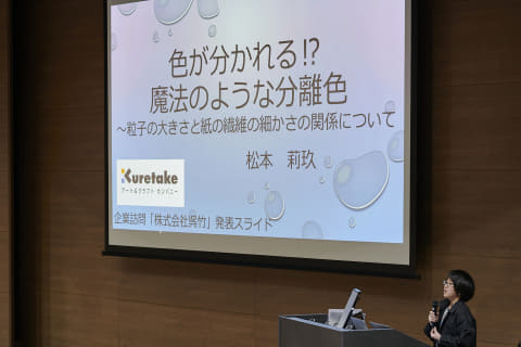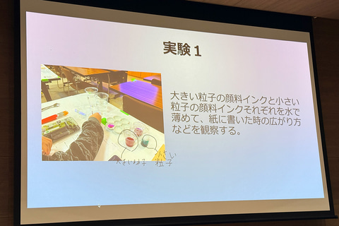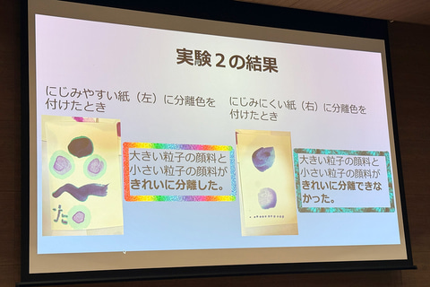 企業での実験では、粒子の大きさが異なる顔料インクを用いて、紙の繊維の違いによって生まれる滲みや色の分離を観察した。その結果、大きな粒子はとどまり、小さな粒子が広がる、それが色の分離として現れることを確かめた。さらに、にじみやすい紙では色が分かれ、にじみにくい紙では分かれにくいことから「 小さな粒子だけが遠くまで運ばれるのではないか 」と考察した。