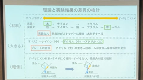 椿本チエインを訪問した野間心生輪さん(中1)は「物体の摩擦」をテーマに実験。材料の組み合わせや表面の状態が滑りやすさを左右する一方、重さや接触面積は大きな要因ではないことを、物理学の「 アモントン・クーロンの法則 」をもとに丁寧に考察し、データを整理した。また、結果が理論通りにならなかった点についても、測定器の衝撃や台の変形、転倒の影響などを挙げて原因を考察した。