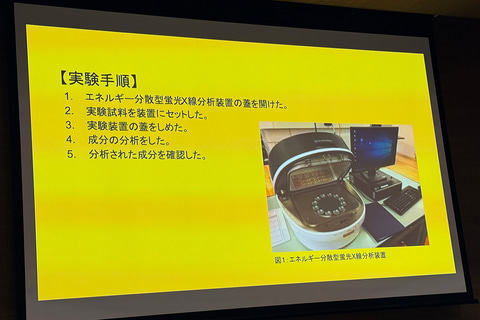 同じく島津製作所を訪問した藤井榮人(中2)さんは、1万円札と1ドル札の違いを分析した。手触りや見た目の差を、 エネルギー分散型蛍光X線分析装置 を用いて成分を比較。色や手触りの違いを、使われている顔料や粘土鉱物成分から考察した。